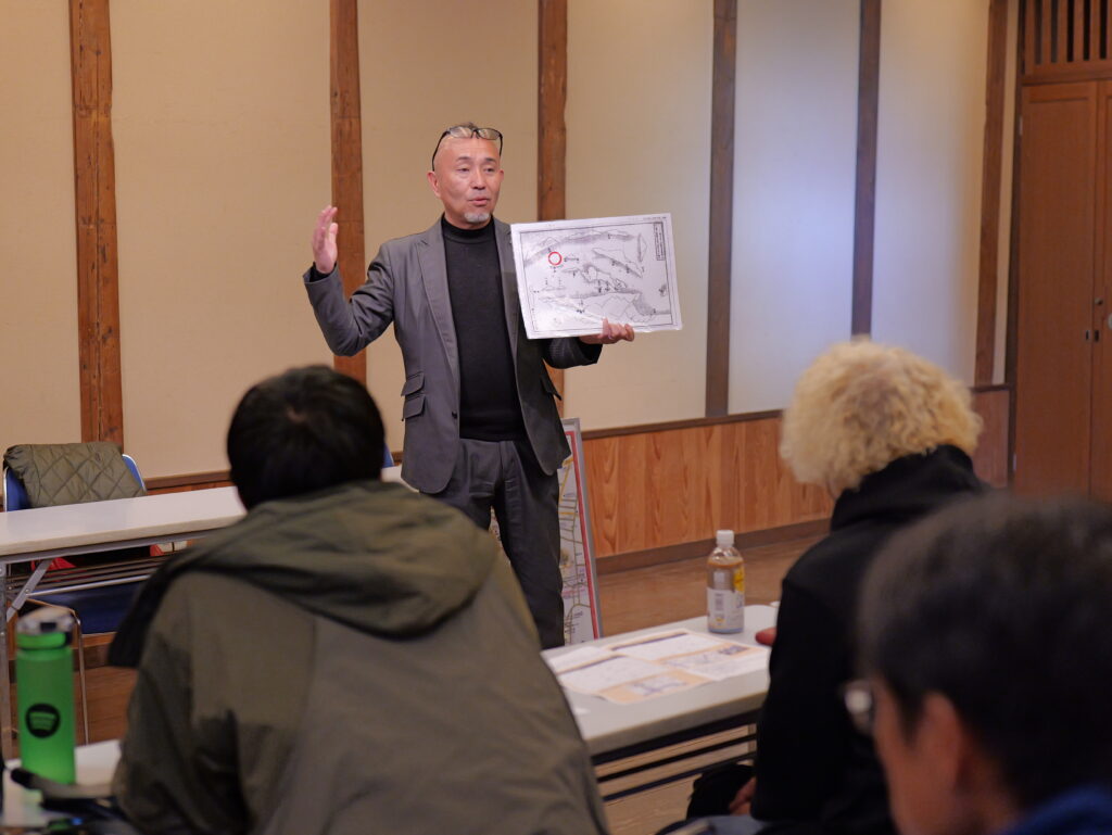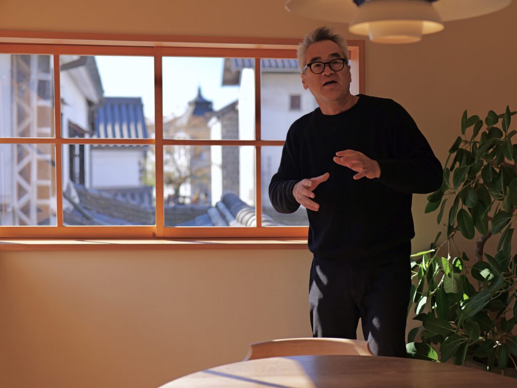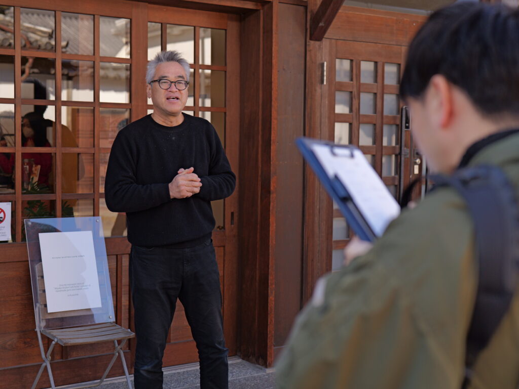 Next, on the second floor of the adjacent Machiya Café Miyake Shoten, you will view a mini-theater introduction to the community film “Kura no Aru Machi” (“The Town with Storehouses”), a project in which Mr. Tsuji served as an executive committee member. Through this, he shares his passion and the spirit behind preserving and passing down Kurashiki’s culture.